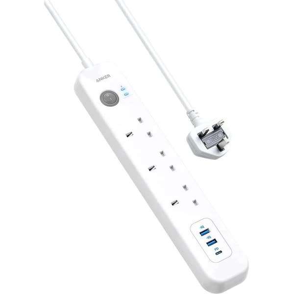 Anker PowerExtend USB-C 3 Strip White – 30W Fast Charging Power Strip with 3 AC Outlets & 3 USB Ports (2 USB-A, 1 USB-C) – 2m Cable, Surge Protection,