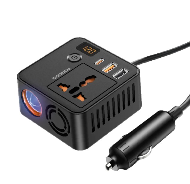 Porodo Universal AC Power Inverter PD-FWCH057 — 200W Car Inverter with USB-C PD 30W, Dual USB-A QC, Smart Cooling & Safety Protections (Black)