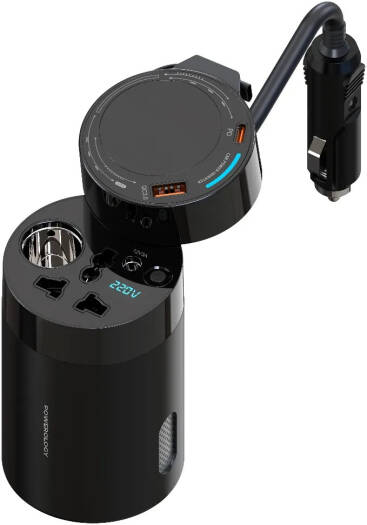 Powerology 150W Cup Holder Power Inverter ā Dual USB-C & USB-A QC3.0 Car Charger (P150INV)