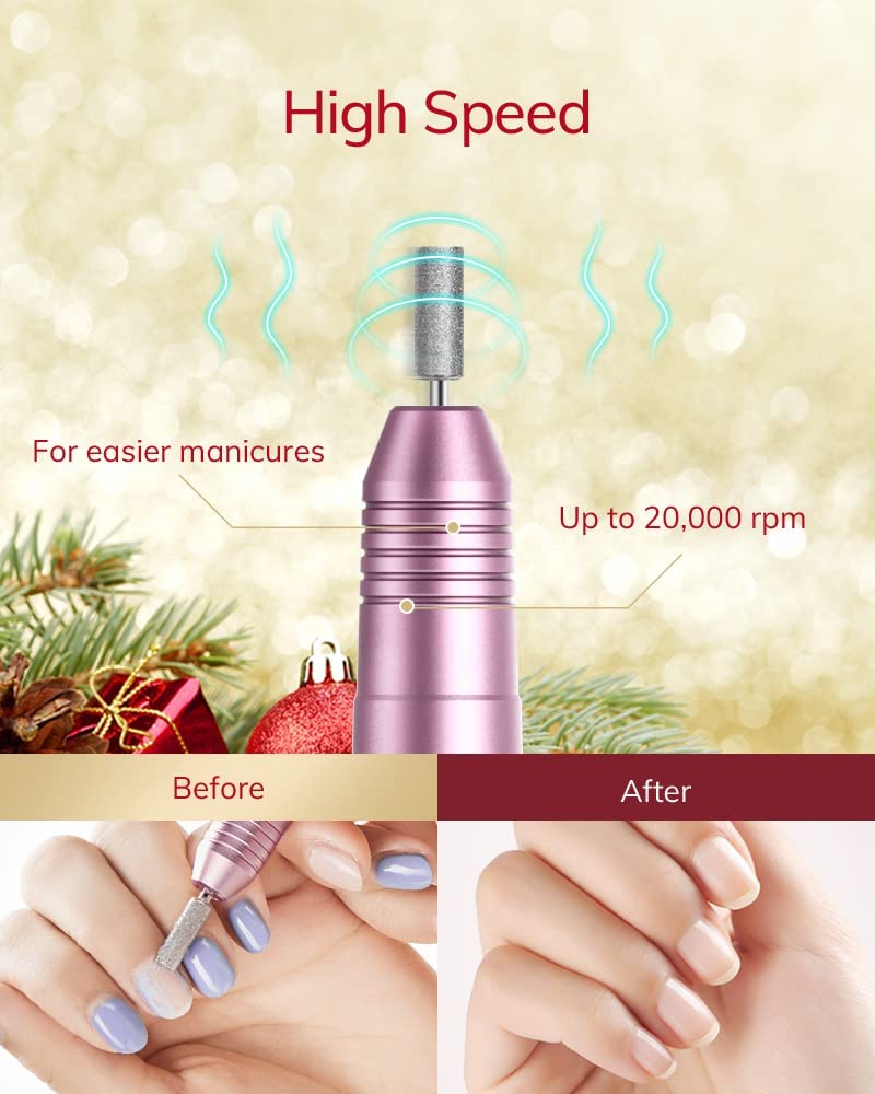The USB-powered nail drill is compact and lightweight, making it perfect for on-the-go use. Its low noise and low heat operation provide a comfortable experience, while the ergonomic design ensures ease of handling during extended use.
