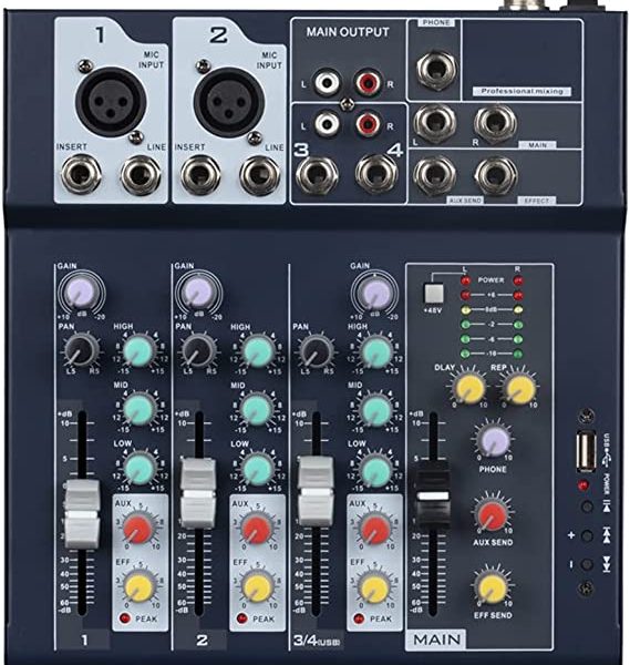 Professional 4-Channel Live Audio Mixer – USB & Bluetooth Connectivity, Built-in Effects, Phantom Power, Compact Design,