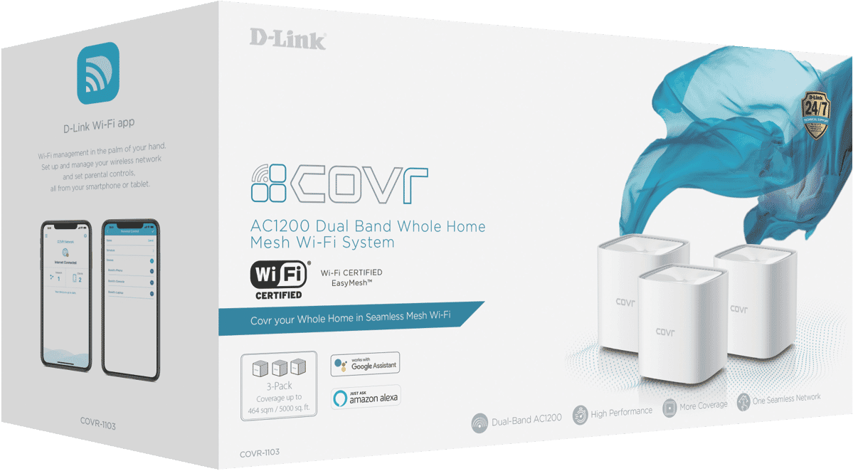 Setting up the D-Link COVR-1103 is straightforward with the D-Link Wi-Fi app, guiding you through installation and network management. The system supports the latest WPA3™ encryption, safeguarding your network against unauthorized access. Additionally, voice control compatibility with Amazon Alexa and Google Assistant offers hands-free network management.