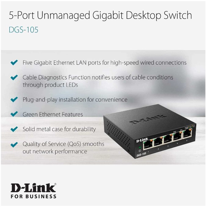 Built with a durable metal housing, the DES-105 is designed for long-term reliability. Its fanless design ensures silent operation, making it ideal for quiet environments. The switch also incorporates D-Link Green Technology, which detects when a connected device is shut down or when there is no Ethernet traffic, allowing the switch to power down idle ports and save energy.