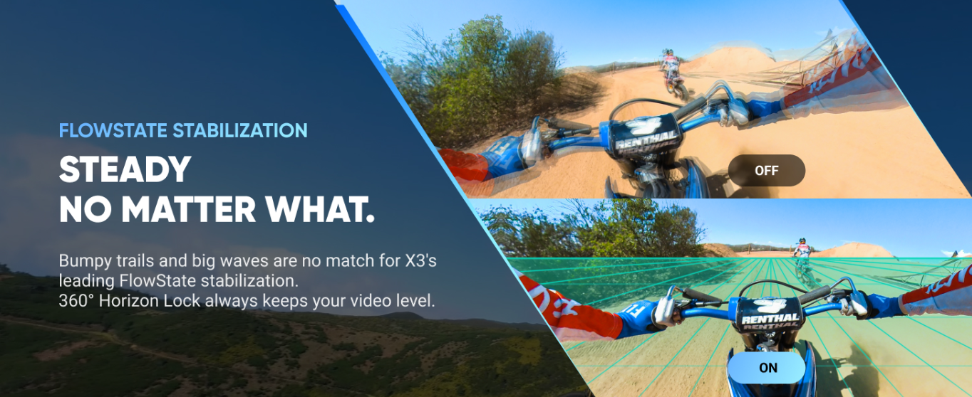 With dual 1/2-inch 48MP sensors and Active HDR, the X3 delivers crisp details even in challenging lighting conditions. Want conventional framing? Switch to single-lens mode and record 4K video without losing stability or quality.