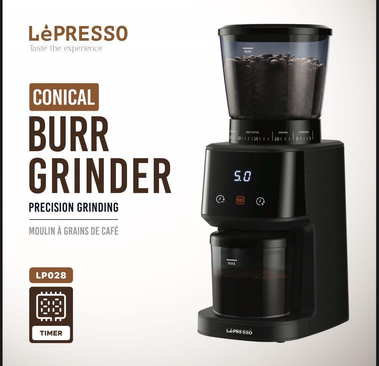 Lepresso Conical Burr Grinder LPCFFM0028 – 31 Grind Settings, 165 W, 275 g Hopper, Timer – Precision Coffee Grinder