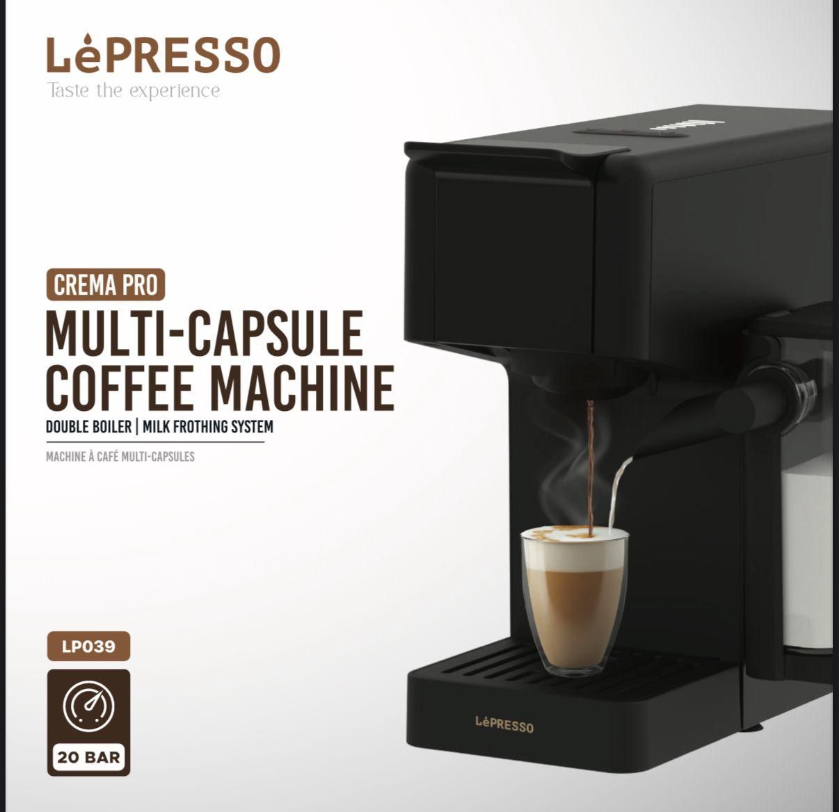 Elevate your home café moments in Oman with the Lepresso Crema Pro Multi-Capsule Coffee Machine LPCFFM0039, a dual-boiler, 20-Bar espresso machine that delivers barista-quality coffee effortlessly. Equipped with a generous 850 mL water tank and 200 mL milk tank, this versatile machine supports Dolce Gusto, Nespresso capsules, and ground coffee, giving you complete brewing flexibility.