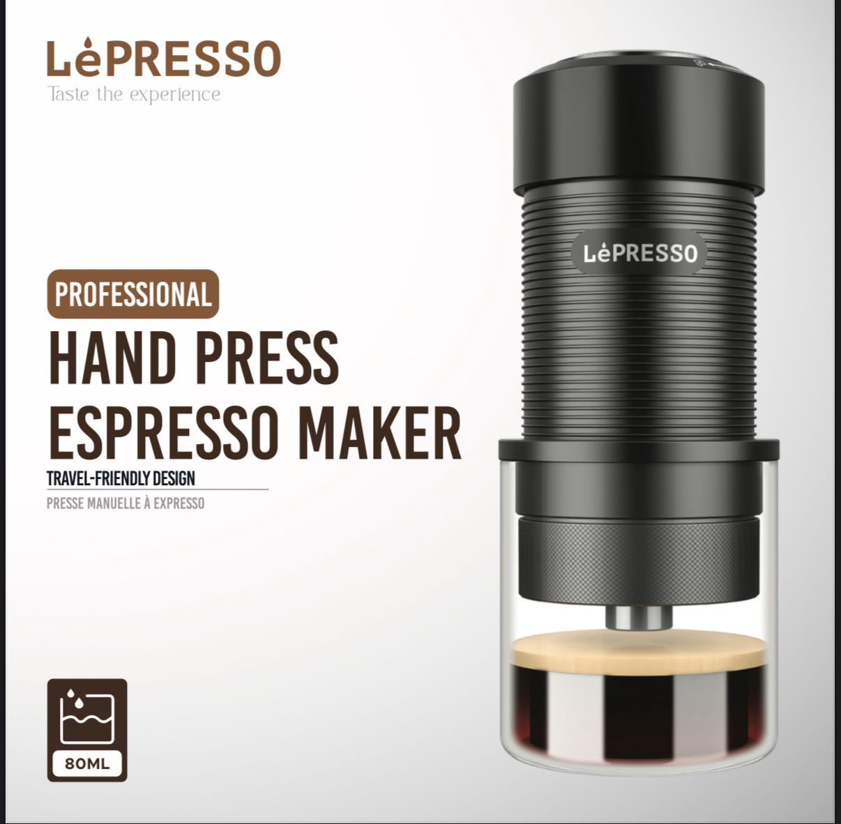 Lepresso Hand Press Espresso Maker LPRJPCMBK – Portable 9-Bar Manual Espresso Brewer, 80 mL, Stainless Steel & Aluminum Alloy –