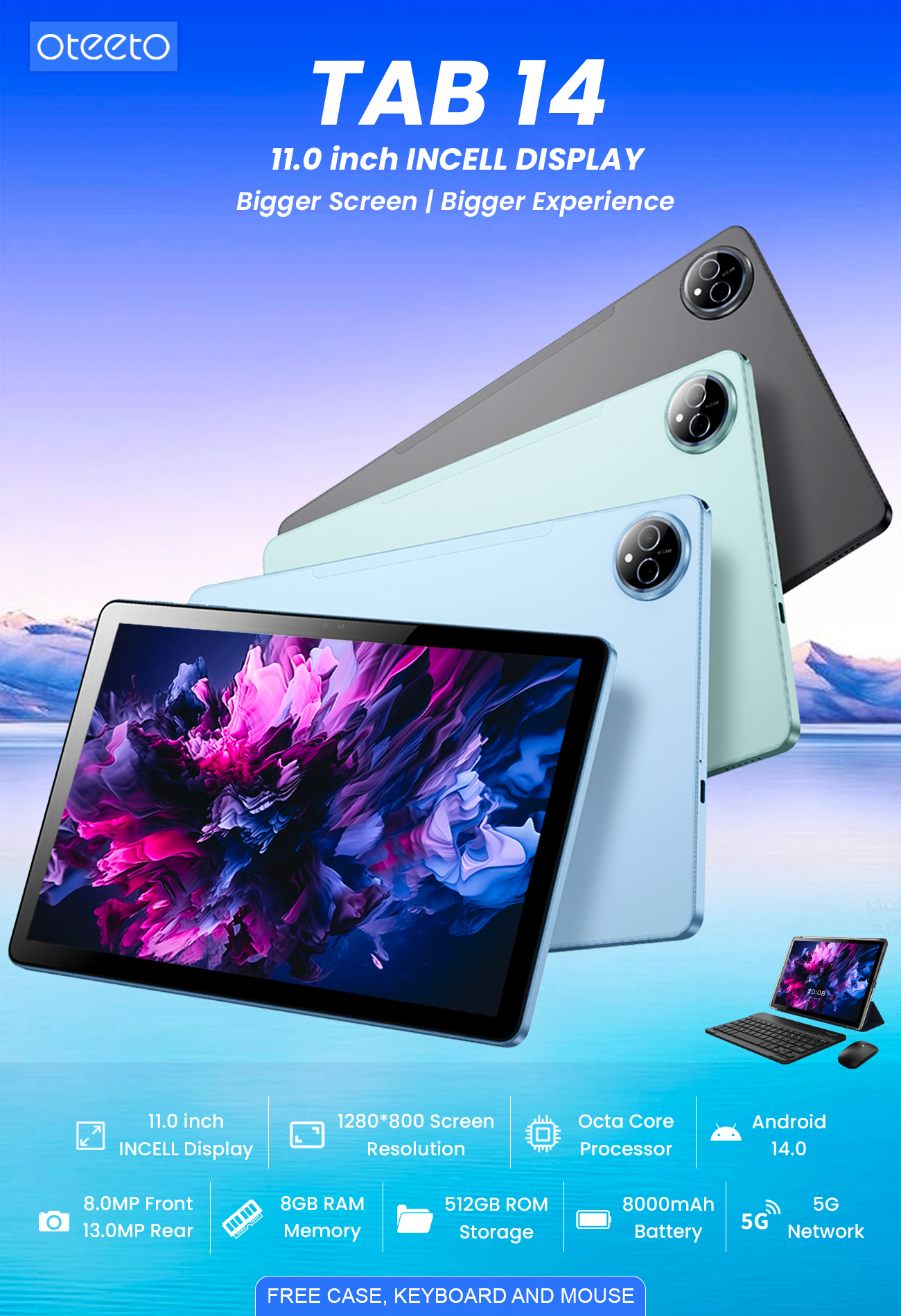 Experience cutting-edge technology with the Oteeto Tab 14 5G Tablet, now available at Sky Gadgets in Oman. This powerful device boasts 8GB RAM and 512GB storage, ensuring seamless multitasking and ample space for all your applications and media.