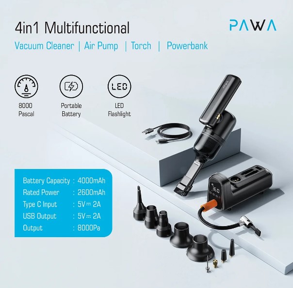 Pawa 4-in-1 Multifunctional Vacuum Cleaner & Air Pump PBINFT41 – Portable Car Vacuum, Air Compressor, LED Torch & Power Bank,