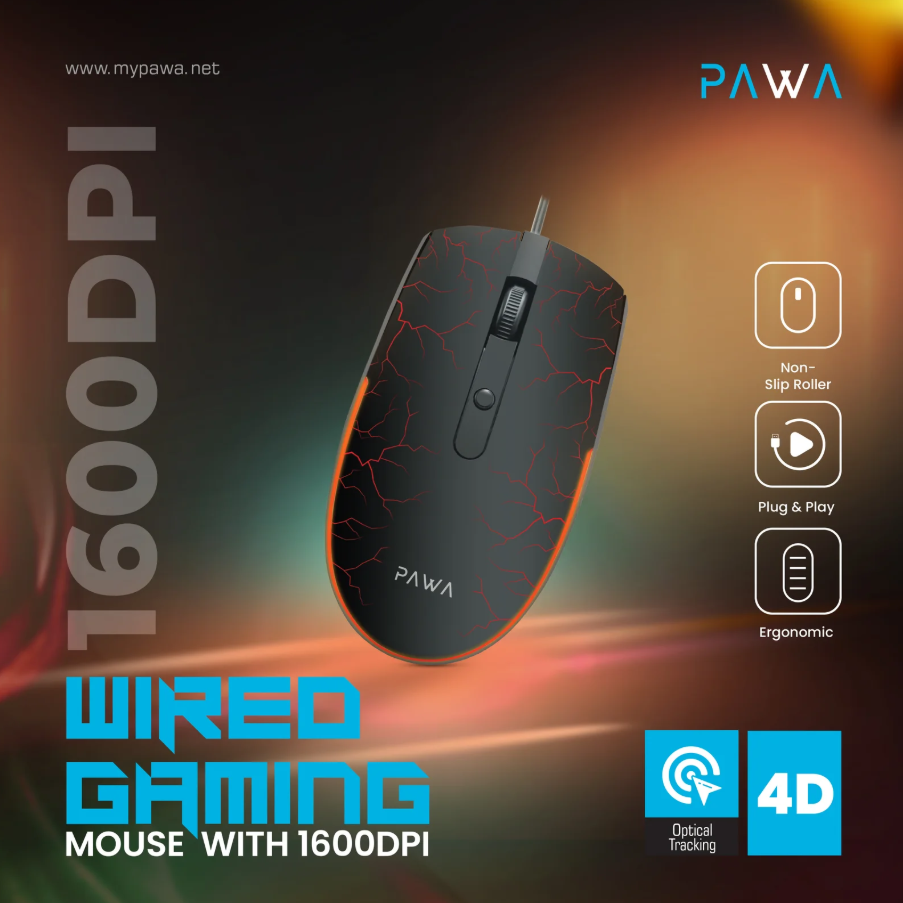 Dominate your game with the Pawa 4D Wired Gaming Mouse PW-MWGMRGB7, now available at Sky Gadgets Oman. This wired gaming mouse brings competitive edge with adjustable 800/1200/1600 DPI, giving you precision targeting and fluid movements across different game styles.