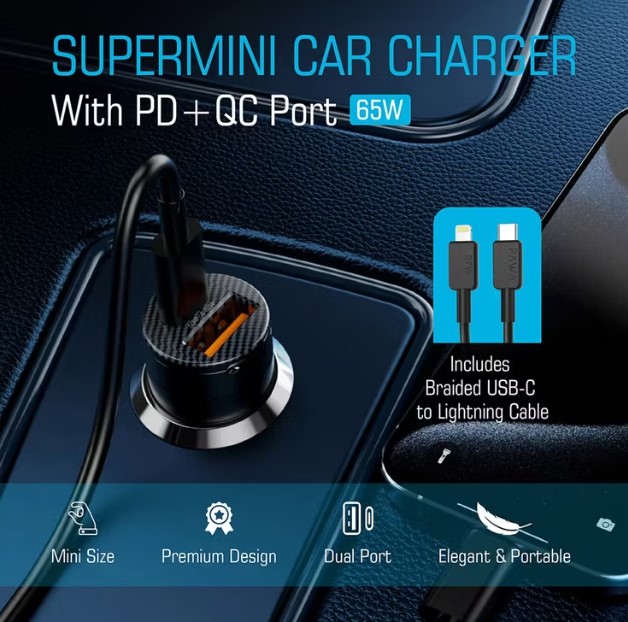 Pawa Supermini 65W Dual Port Car Charger with PD & QC Ports + Braided Type-C to Lightning Cable (PW-PDTCN65L)