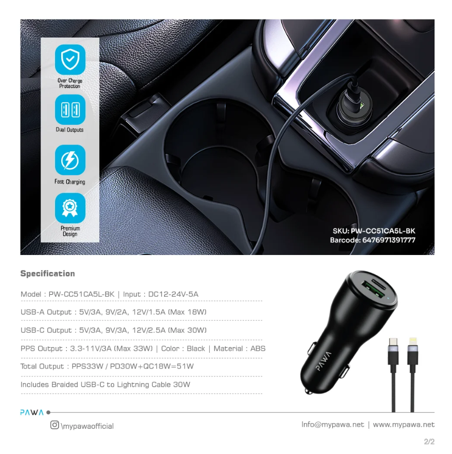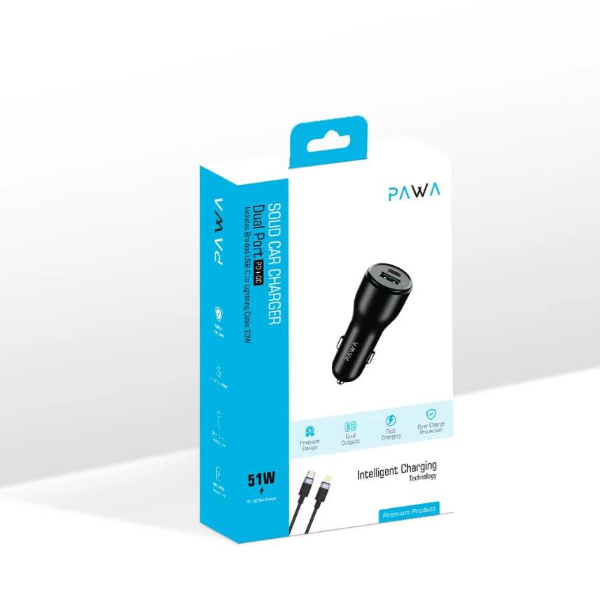 Pawa Type C to Lightning Cable Car Charger in Oman – 51W Fast Dual Port