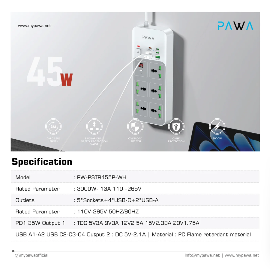 Upgrade your power management with the Power Strip with Timer in Oman by Pawa Universal PSTR455P. Designed for convenience and efficiency, this smart power strip helps you control your devices with ease while ensuring safe and reliable charging.