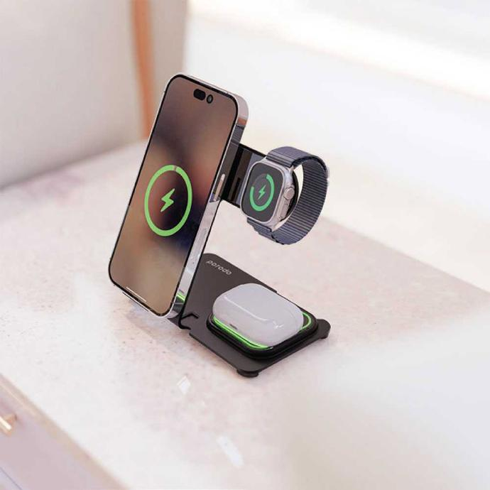 Experience the convenience and efficiency of the Porodo 3-in-1 Dual Coil Wireless Charging Dock, the perfect solution for your daily charging needs.