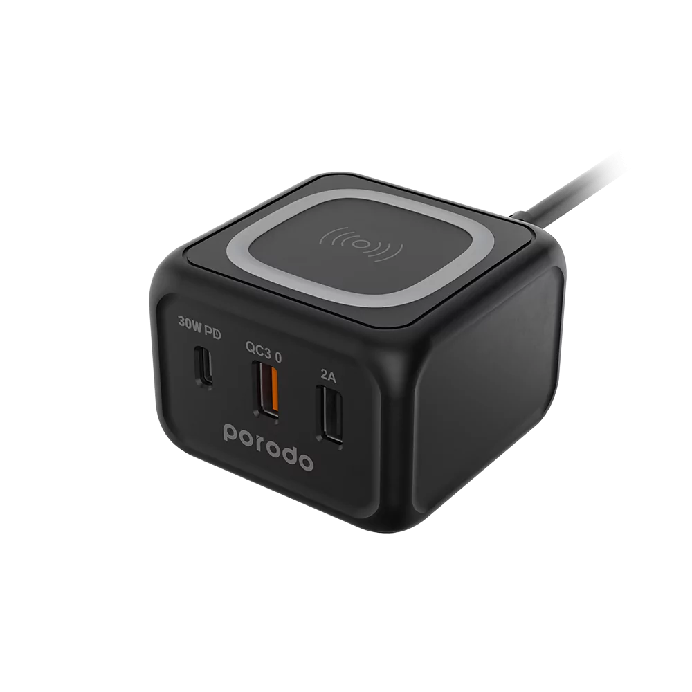 Porodo 3-Port Wireless Charger 30W PD-FWCH005-BK – Fast Charging Station with 15W Wireless Pad, PD 30W USB-C, Dual USB-A Outputs