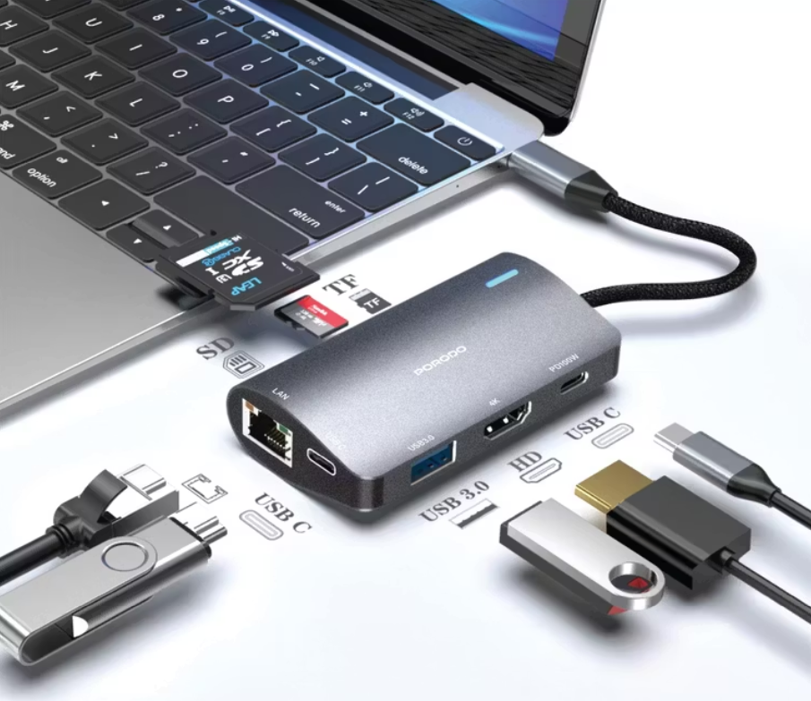 Porodo 4K 7‑in‑1 Multi‑Port USB‑C Hub (Model PDRDS71GY) – Aluminium Alloy, 100 W Power Delivery, Ethernet & SD
