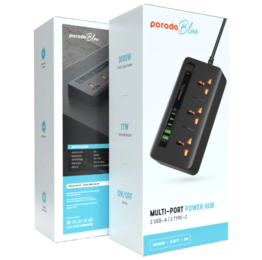 Porodo Blue Multi-Port Power Hub PB-3ACC2CM – 3 AC Sockets + 2×USB-A + 3×USB-C, 3000W (GCC Ready)