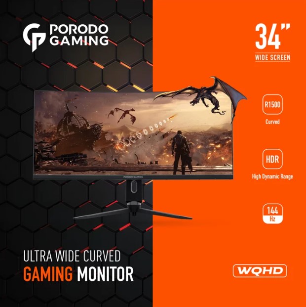 Porodo Gaming UltraWide 34″ Curved Monitor (PDX524-BK) – 3440×1440 WQHD, 144Hz, HDR, VA Panel – Price in Oman