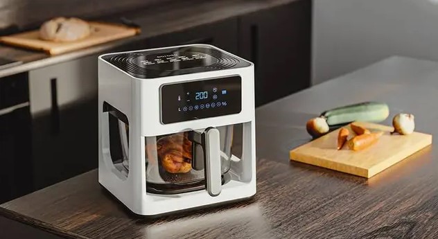 The transparent glass pot not only adds a sleek look but also lets you monitor your food without opening the fryer, retaining heat and flavor. Its compact design and white finish make it a stylish addition to any kitchen.