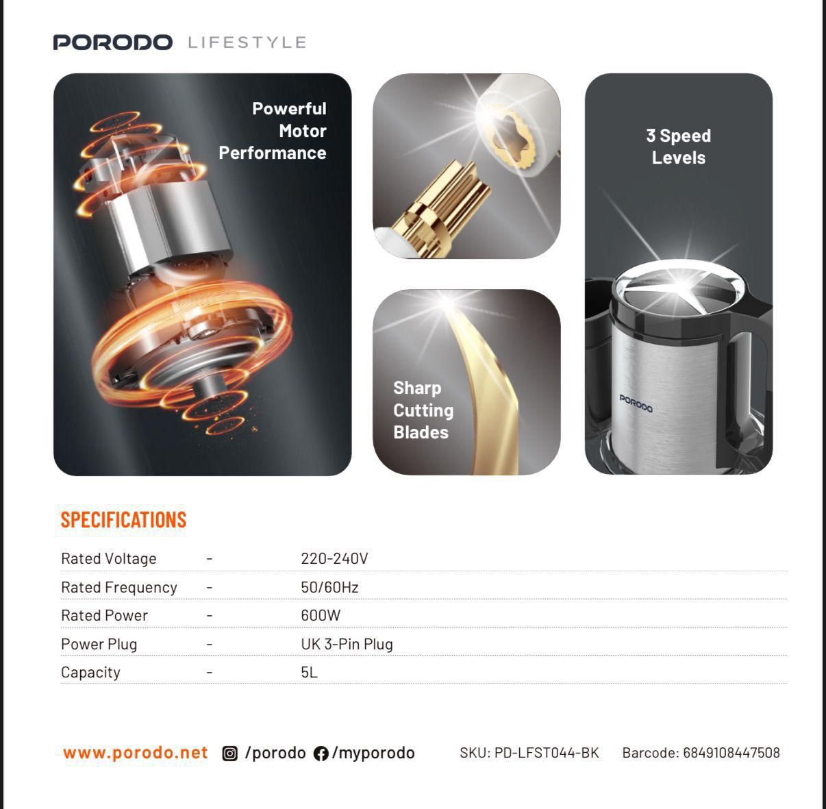 Designed for convenience, the Porodo PD-LFST044-BK features a UK 3-pin plug, compatible with standard outlets in Oman. Its sleek black design adds a modern touch to any kitchen decor.