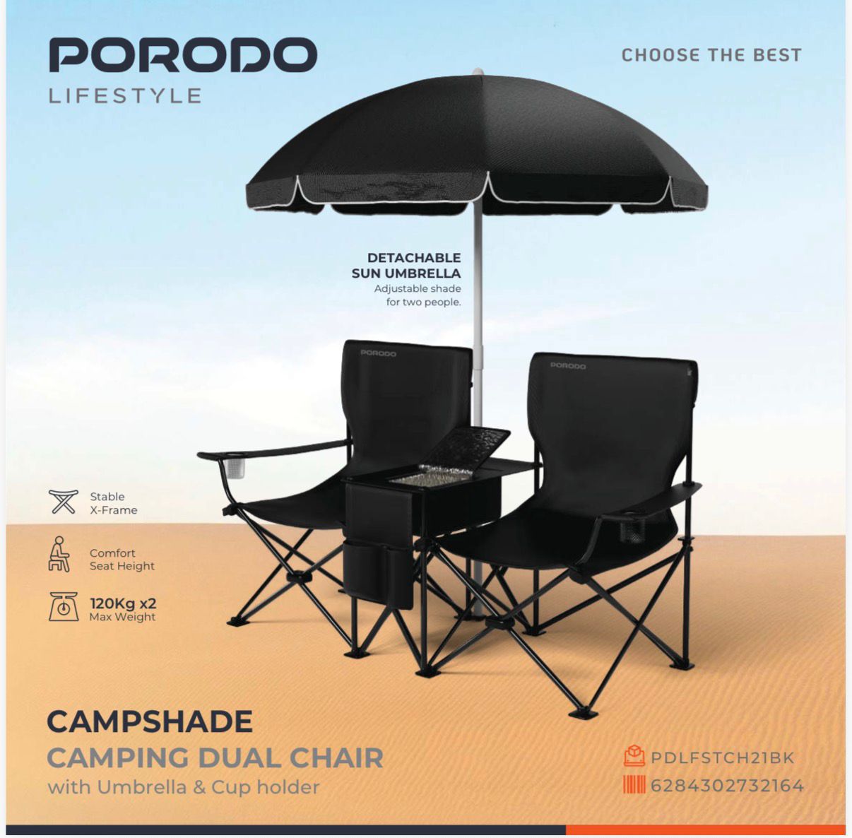Relax together in style with the Porodo Lifestyle Campshade Dual Camping Chair, an all-in-one camping loveseat built for comfort, convenience, and shade. Designed for outdoor adventures in Oman, this chair features a strong 16 mm powder-coated steel frame that supports up to 120 kg per seat, making it ideal for two people.