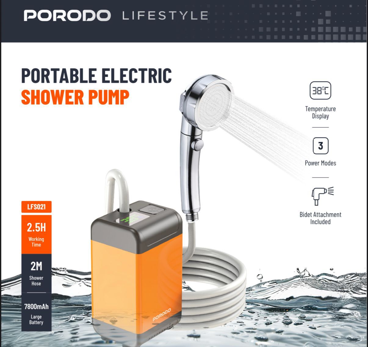 Porodo Lifestyle Portable Electric Shower Pump PD‑LFST021‑OG – 7800 mAh Battery, LED Temp Display & Bidet for Camping (Price In Oman)