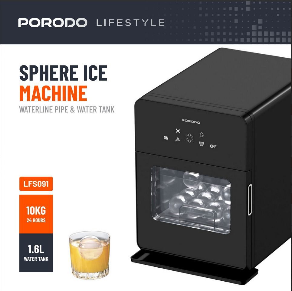 Introducing the Porodo Lifestyle Sphere Ice Machine (PD‑LFST091‑BK) at Sky Gadgets Oman—a sleek countertop device that delivers premium sphere ice cubes Oman right at home. This Porodo sphere ice maker Oman cycles every 40 minutes to produce 4 crystal-clear, round ice spheres, delivering up to 160 pieces per day (≈10 kg). Featuring a 1.6 L water tank and a 3 kg ice basket, it ensures minimal refills during extended use.