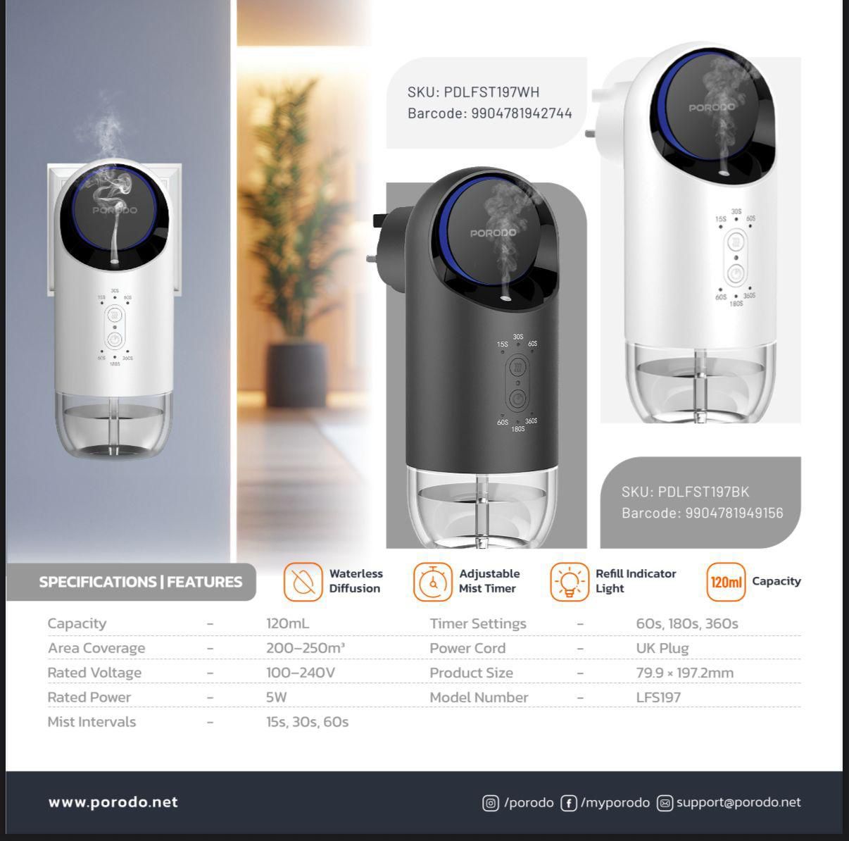 Porodo Lifestyle Wall Plug‑In Essential Oil Diffuser – 120 mL Waterless Aroma & Adjustable Mist Timer –