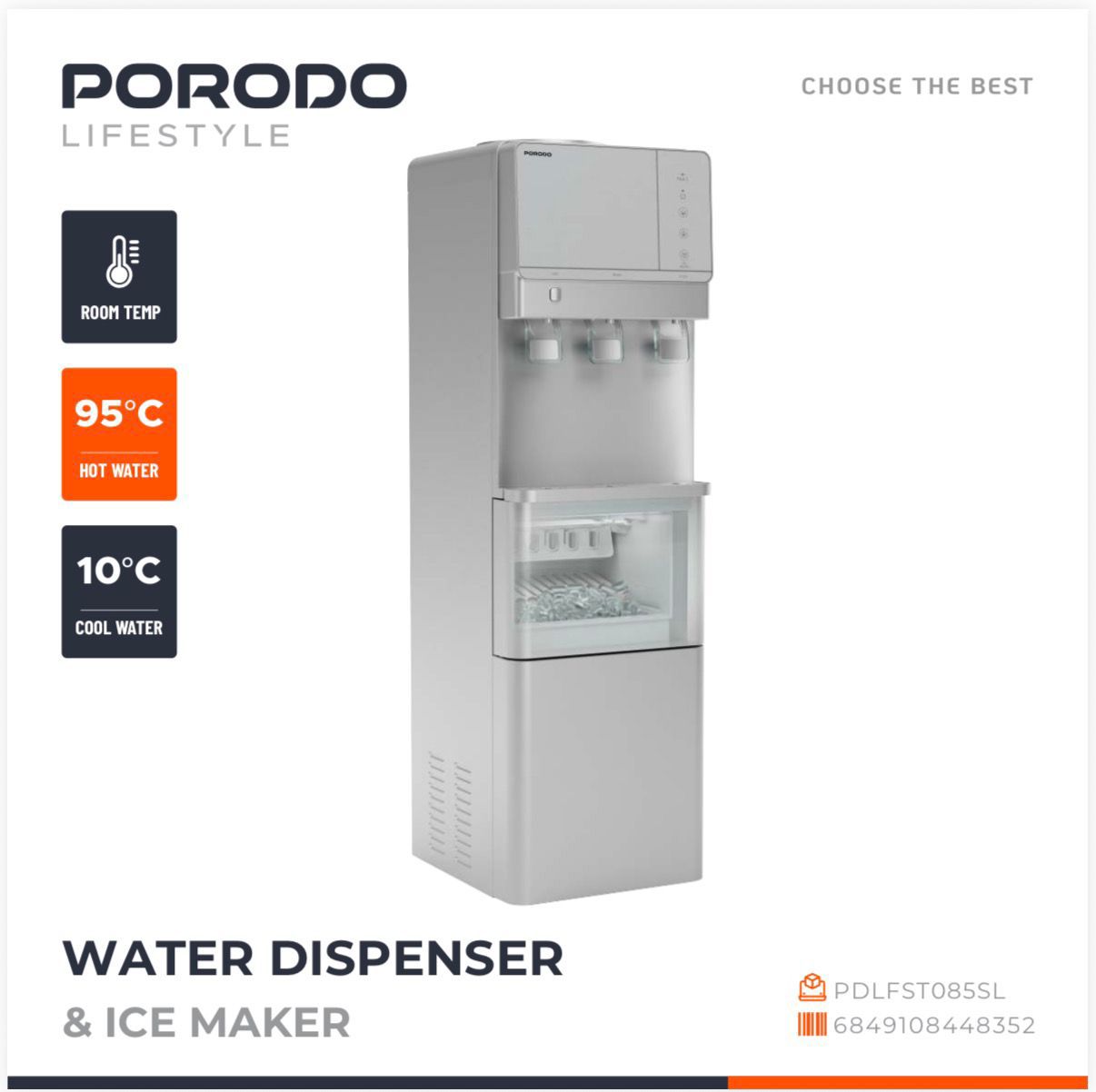 Bring convenience and luxury to your home or office with the Porodo Lifestyle Water Dispenser & Ice Maker. This versatile appliance delivers hot water at 90–95 °C, refreshing cold water at 5–10 °C, and even ice with a 1.1 kg storage capacity, making it your all-in-one hydration solution. The top-load stainless steel tanks ensure durability, hygiene, and premium quality, while energy-efficient heating and cooling help reduce power consumption.