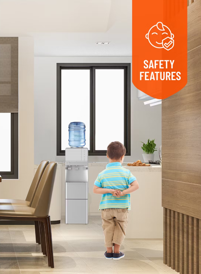 Its cooling power is rated at 100 W, and the heating power reaches 500 W, giving you a fast and efficient experience. You’ll enjoy up to 2.0 L/hour of cold water and 5.0 L/hour of hot water, ideal for everything from morning tea to chilled drinks. The built-in ice maker produces 9 cubes per cycle, ready to chill your drinks whenever you need them. A child-safety lock ensures safe dispensing, and the unit runs on a standard UK 3-pin plug.