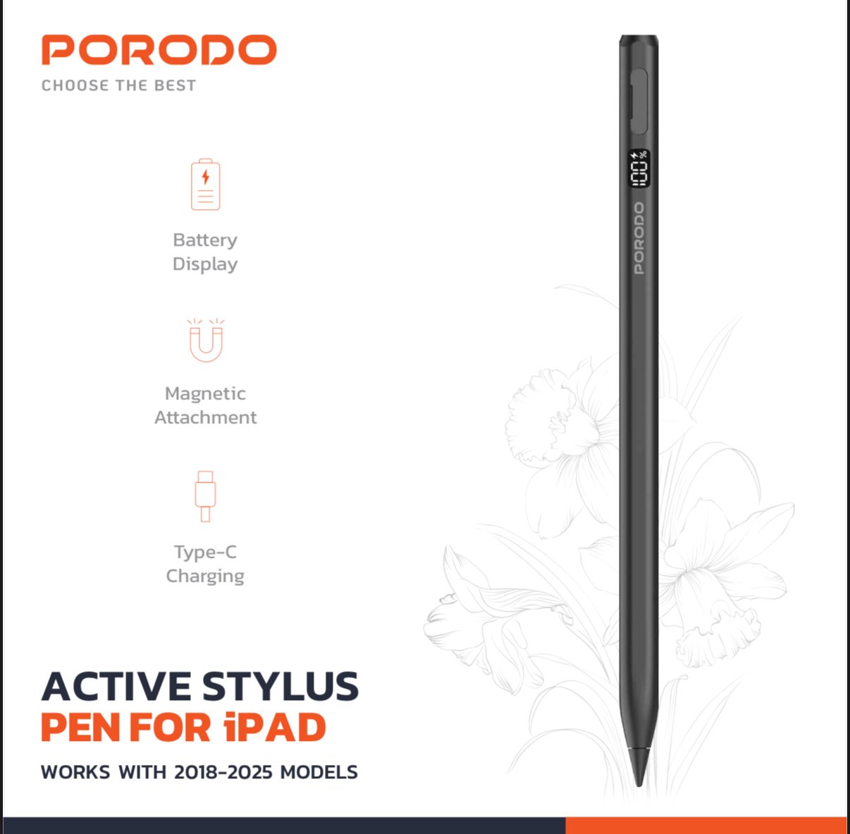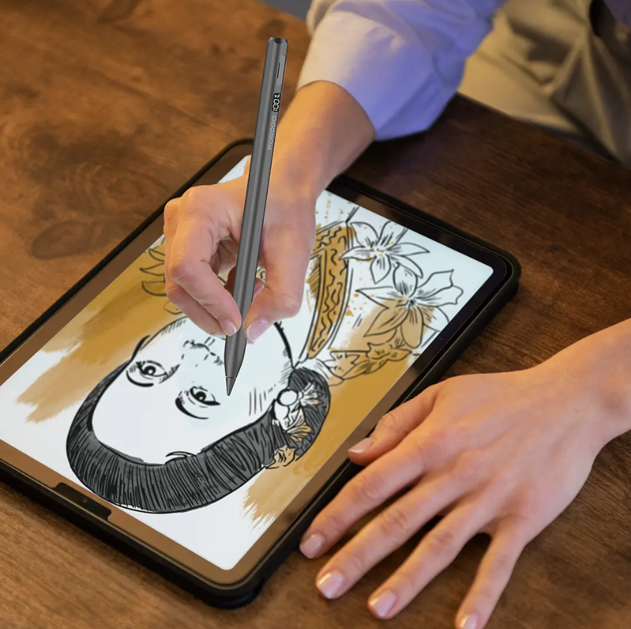 Porodo Magnetic Active Stylus Pen PD‑ETK13 for iPad – 12 h Battery, Type‑C & Magnetic Charging, Battery Display –