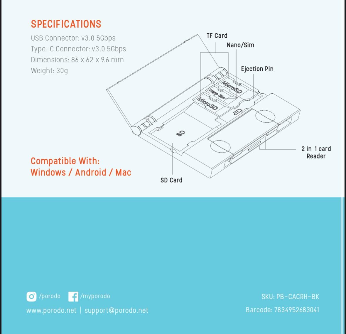 Easily manage your photos, files, and backup cards with the Porodo PB‑CACRH‑BK Oman, a sleek USB‑C multi‑card reader and storage case designed for travel and daily use. This compact device supports SD & MicroSD formats side by side—ideal for transferring high-resolution images from DSLR or drone cards using your laptop’s USB‑C port.