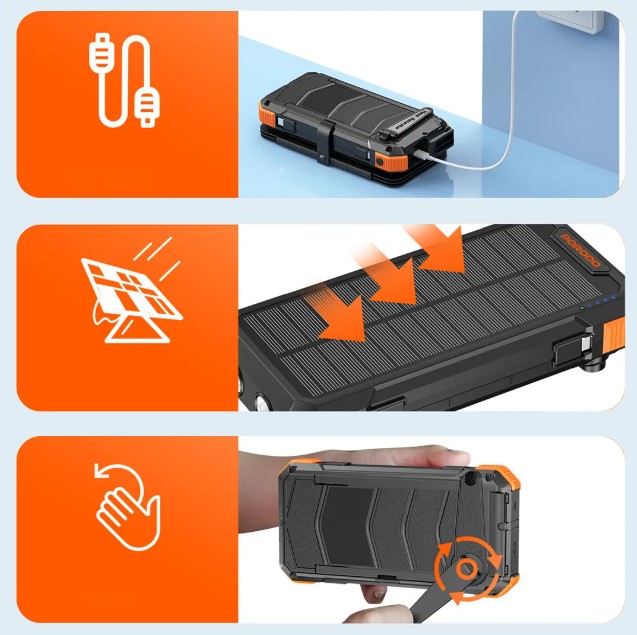 Stay powered even off-grid with the Porodo PB070 solar power bank Oman, a rugged outdoor solar powerbank designed for camping, travel, emergencies or daily use. With a 20,000 mAh capacity, it offers extended backup via four detachable solar panels that harvest sunlight whenever you’re outdoors—no outlet needed. Inside you’ll also find hand‑crank charging for extra flexibility in remote locations.