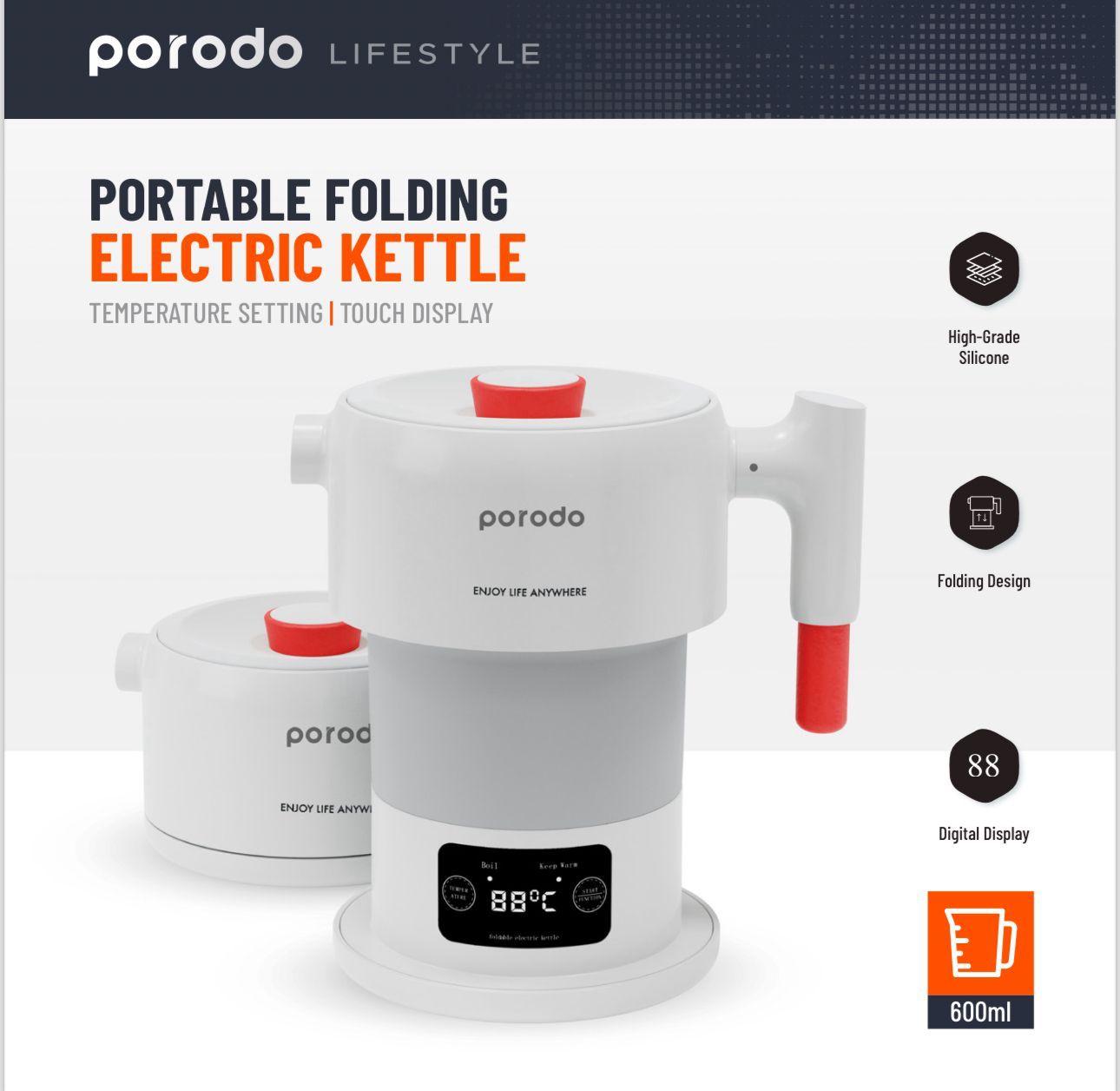 Porodo PD-KTLD850W-WH Portable Folding Electric Kettle – 600ml, 850W, Touch Display, Boil-Dry Protection – Ideal for Travel and Compact Kitchens