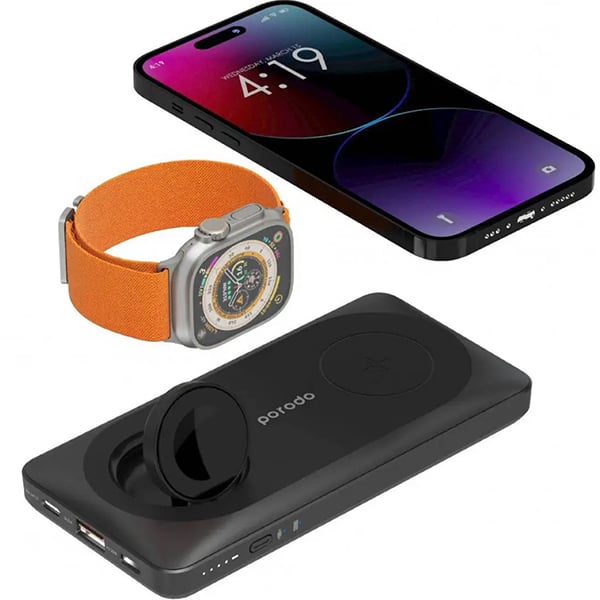 Stay powered on the move with the Porodo PD‑PBFCH021‑BK Oman, a super-slim 10 000 mAh MagSafe power bank capable of charging four devices simultaneously. Featuring 20 W PD USB‑C fast output, this sleek device powers up your iPhone, iPad, or compatible laptop swiftly. Enjoy 15 W wireless charging via MagSafe for seamless cable‑free topping-up, while the integrated foldable Apple Watch charger adds convenience for your smartwatch. A USB‑A port also delivers 22.5 W QC output for older devices.