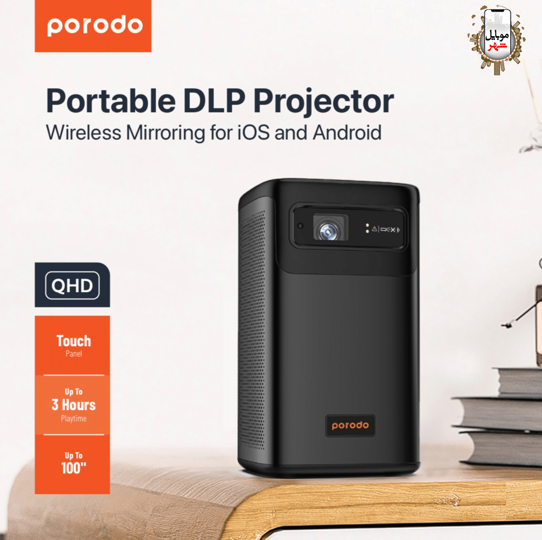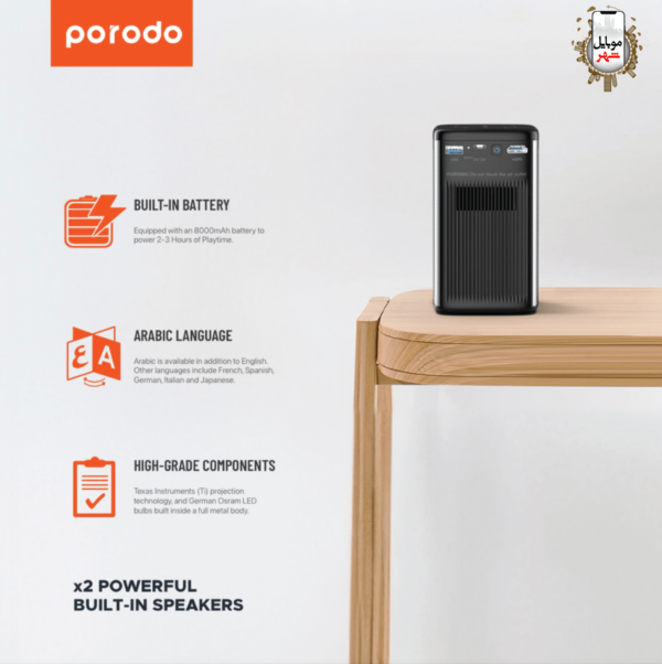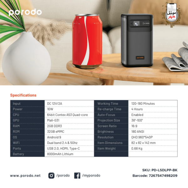 Porodo Portable DLP Projector PD-LSDLPP-BK – 960×540 QHD, Android 9, 8000 mAh Battery & Wireless Mirroring