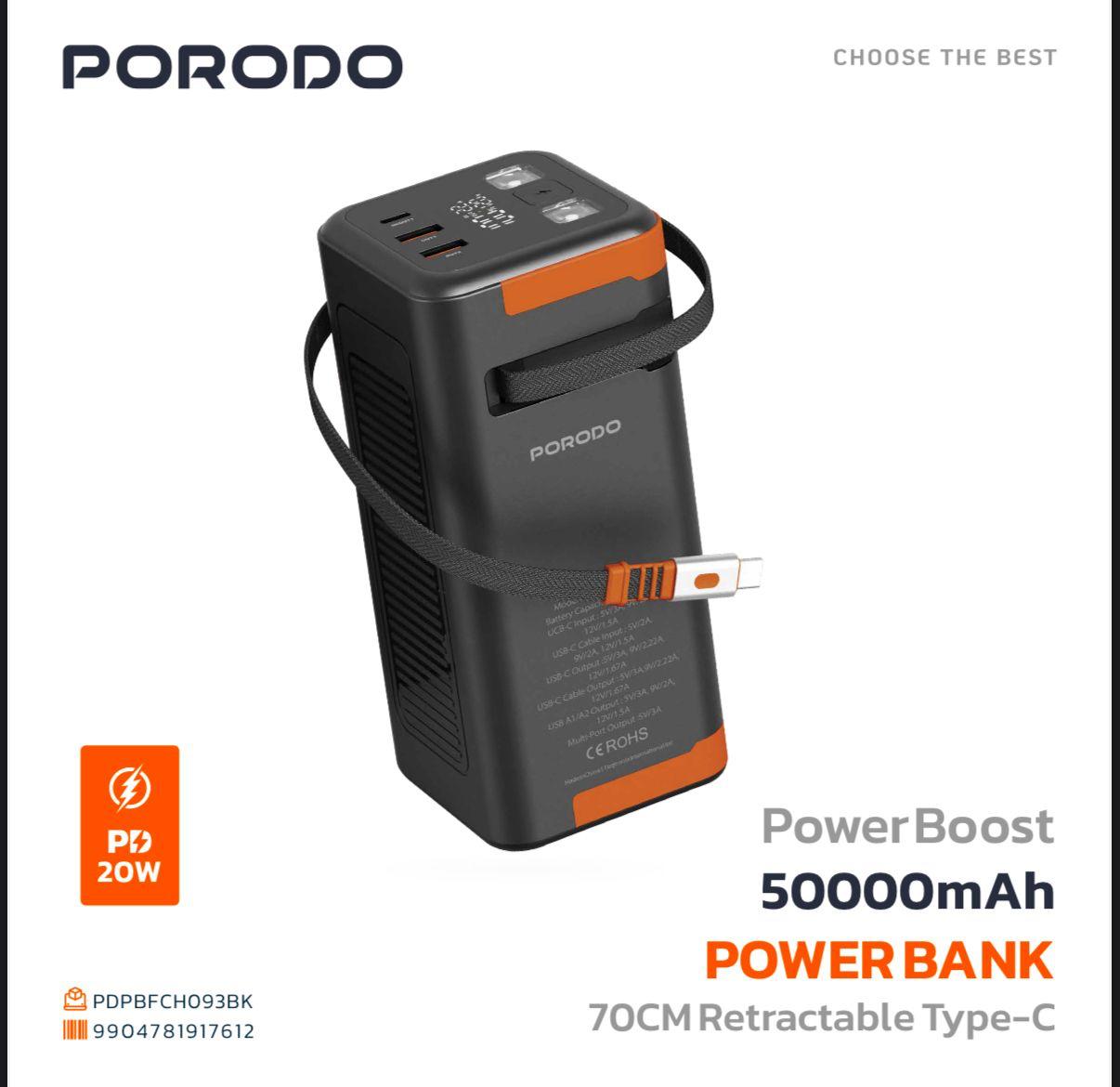 Porodo Power Boost 50 000 mAh Power Bank PD 20 W with Built‑in USB‑C Cable (CH093) –