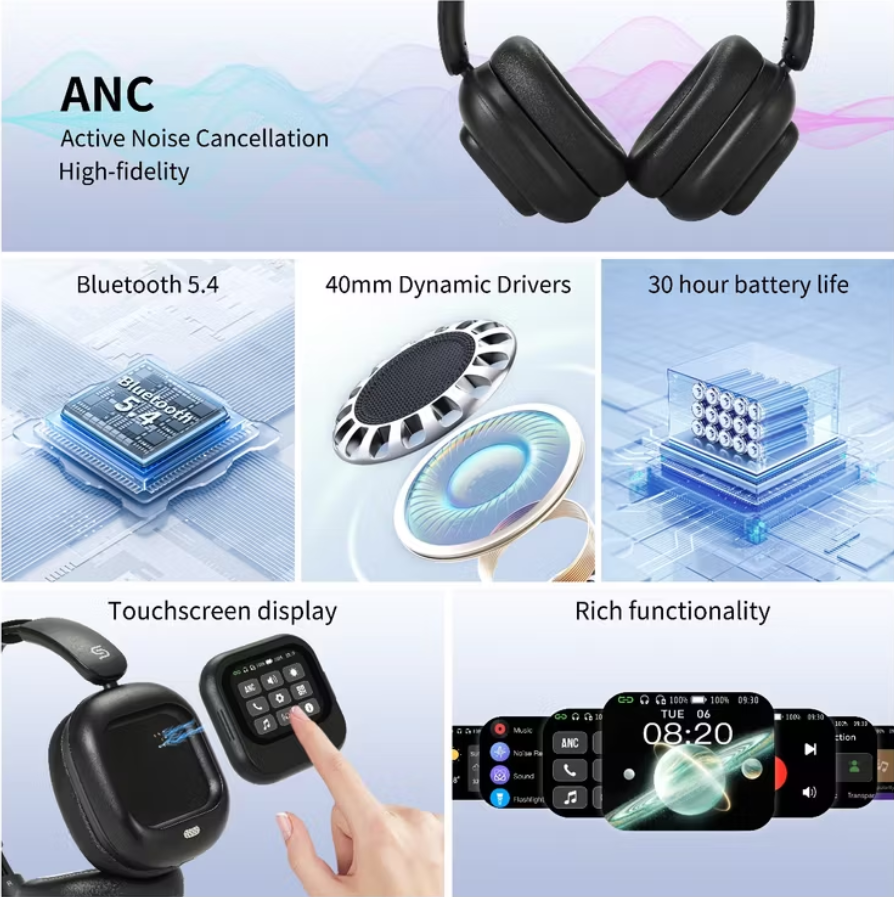 Porodo Soundtec Touch Wave ANC Headphones + Detachable Touch Screen (PDJYBN618) – Wireless Over-Ear ANC Headset with Foldable Design (Price In Oman)