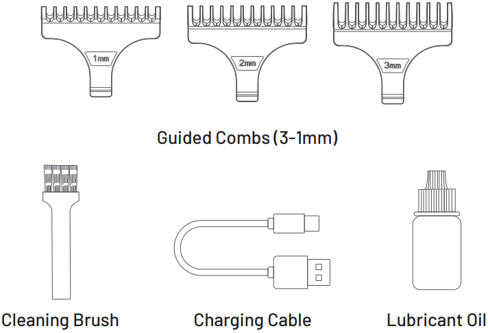 Included combs: multiple guide combs (1 / 2 / 3 mm typical).