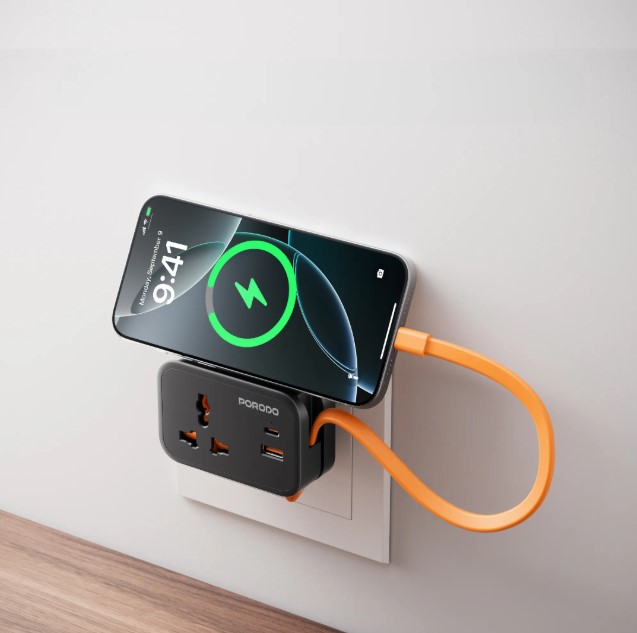 Make charging simpler at home or office with the Porodo Universal Wall Socket Oman, model PD‑FWCH056, a smart universal wall socket with USB‑C and USB‑A ports. This device features a UK‑compliant 3‑pin plug and a built‑in 30 cm USB‑C cable, enabling neat and tangle‑free charging. It offers PD 20 W fast charging on USB‑C and QC 18 W output on USB‑A, making it an ideal Porodo wall socket fast chargers Oman solution.