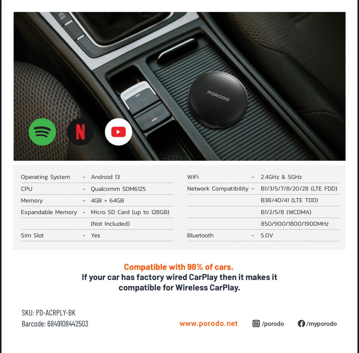 Revolutionize your car’s tech with the Porodo Wireless Carplay & 4G Router, now available at Sky Gadgets Oman. This innovative device allows you to convert wired Carplay to wireless effortlessly, making your driving experience smoother and more connected. With built-in 4G router support, this device ensures high-speed internet connectivity for your car, allowing seamless streaming, navigation, and more while on the go.