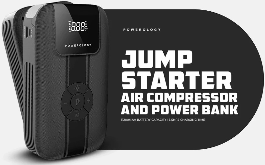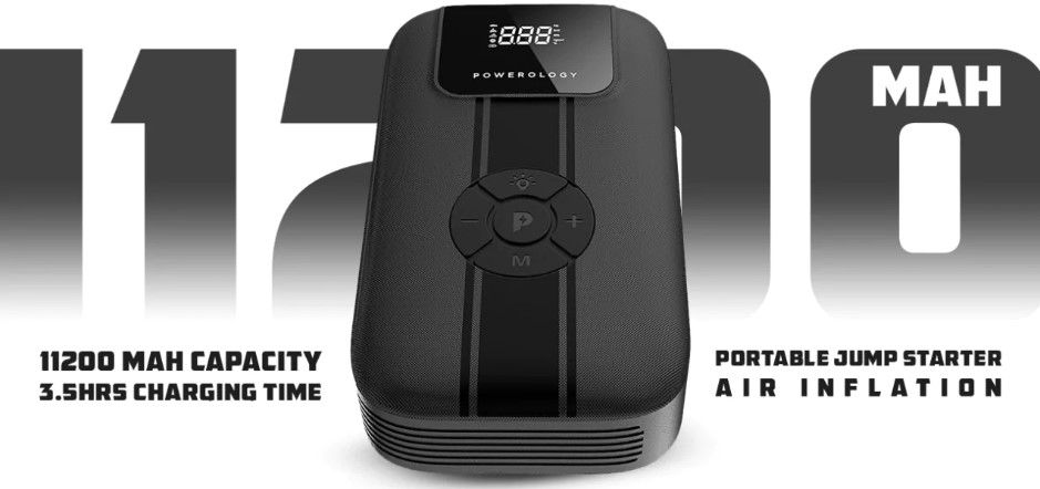Powerology 11200mAh Jump Starter with Air Compressor – Portable Car Battery Booster & Power Bank (PPBCHA13-BK)