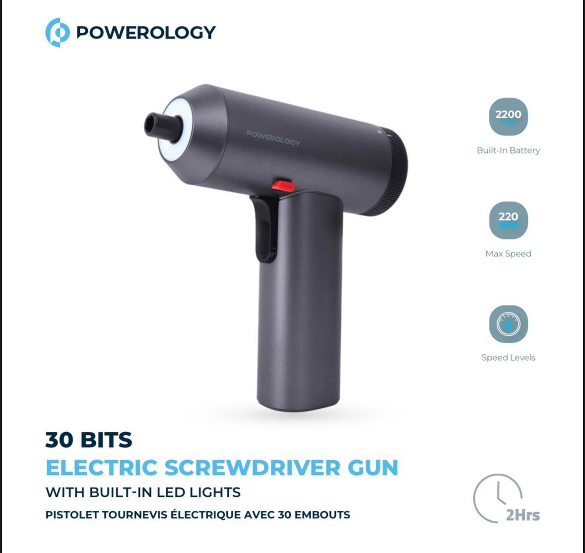 Powerology 30-Bit Rechargeable Electric Screwdriver Gun P30IN1CSS — 2200mAh, 6 Speeds, LED & Type-C Charging |