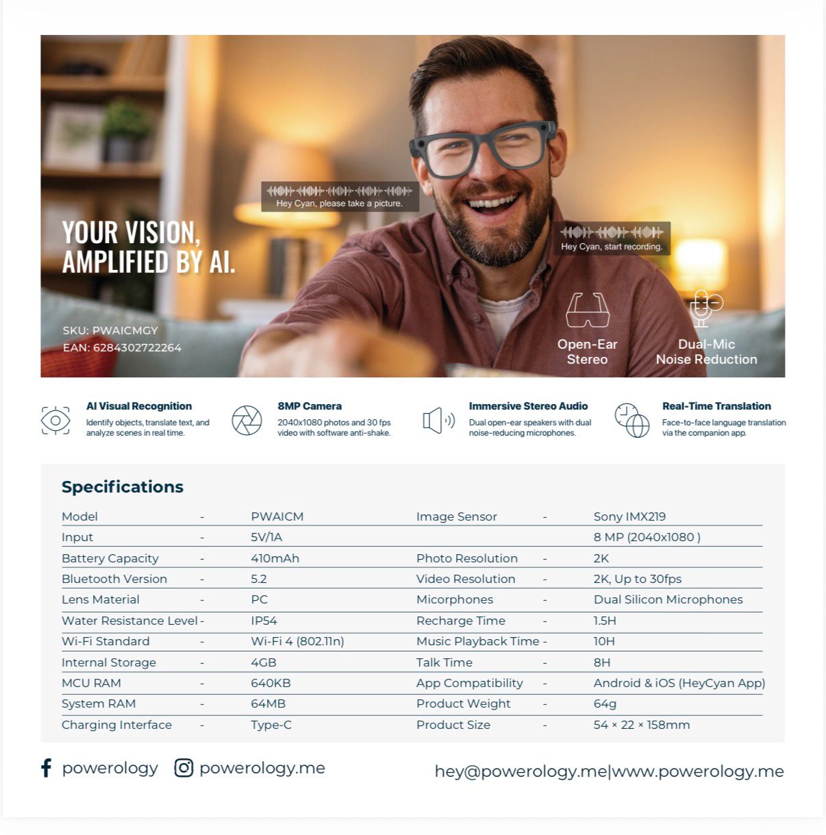 With open-ear stereo audio, dual silicone noise-canceling microphones and open-ear stereo smart glasses Oman design, you remain aware of your surroundings while enjoying immersive sound and hands-free calls. The IP54 rated build ensures durability and the smart glasses IP54 water resistant Oman rating gives you everyday peace of mind. Compatible with Android & iOS via companion app, these smart glasses Android iOS app Oman integrate seamlessly into your mobile lifestyle. At Sky Gadgets Oman, we bring you the Powerology Paganspo — a sophisticated mix of eyewear, camera and wearable tech, all in one.