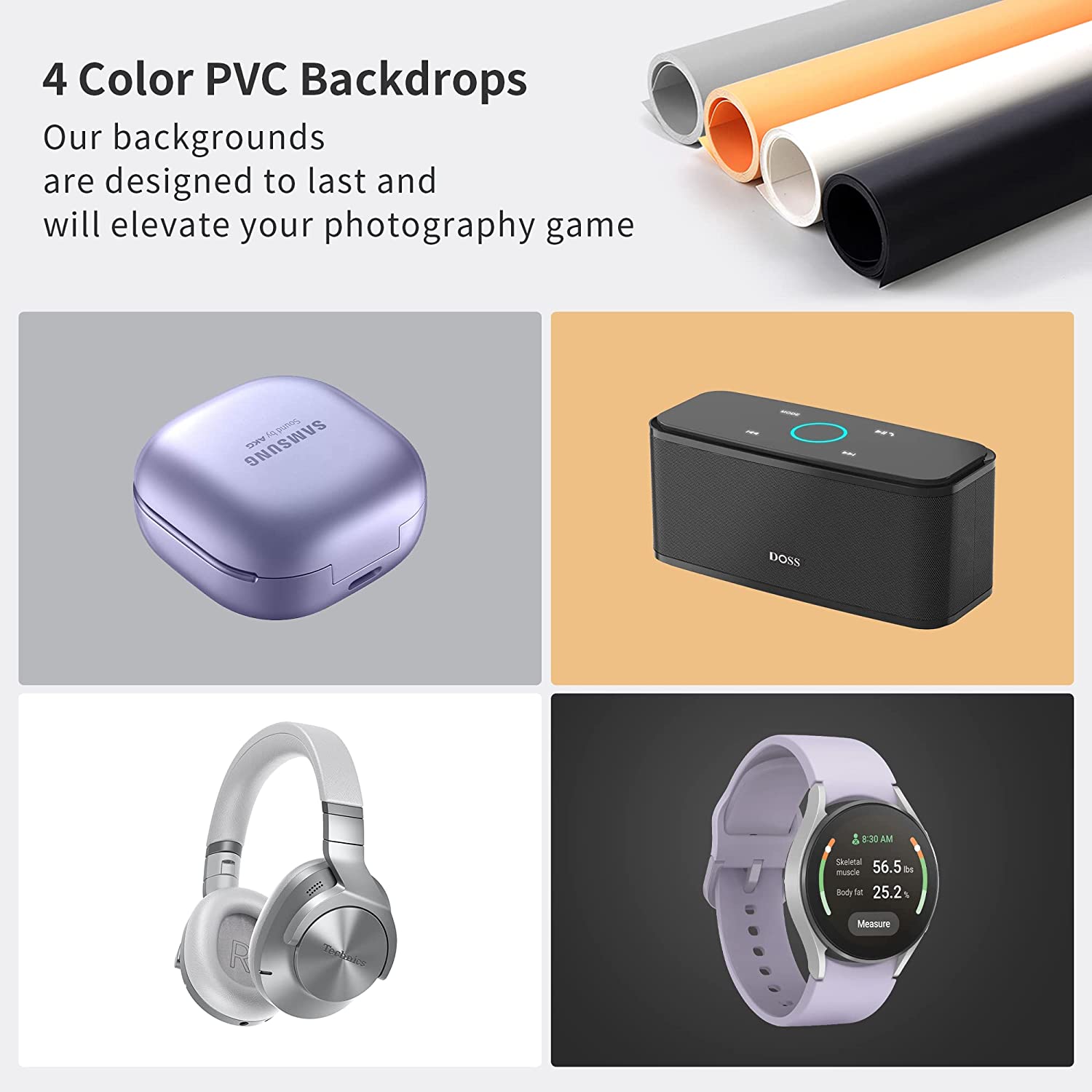Backdrops Included: 6 PVC (Black, White, Gray, Orange, Red, Blue)
