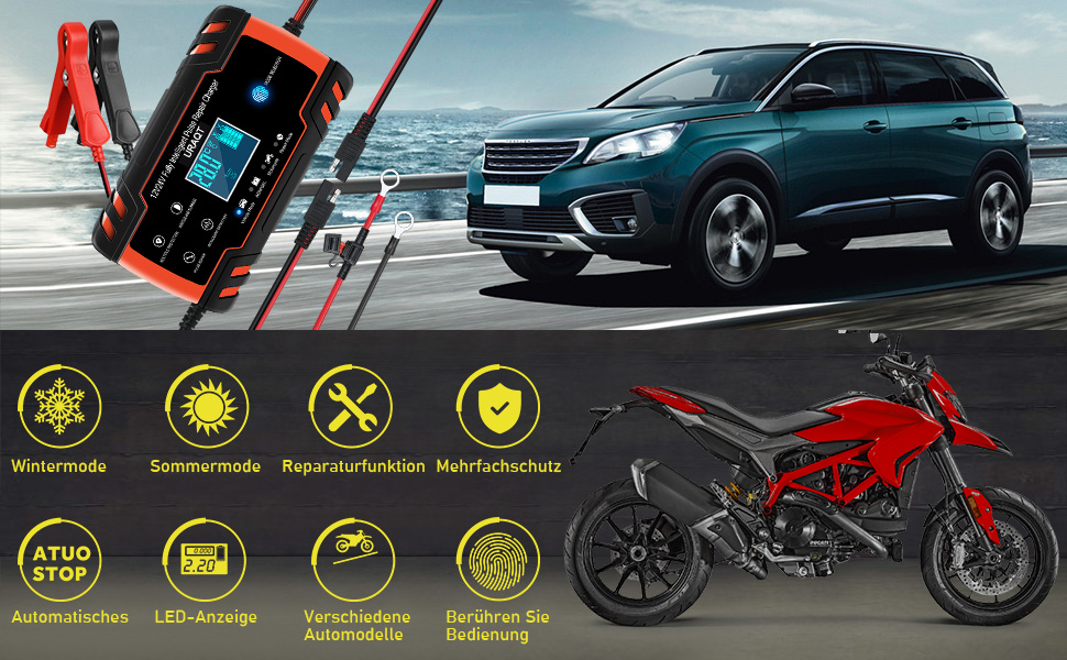 URAQT 12V Smart Battery Charger – Automatic Portable Charger for Car & Motorcycle Batteries