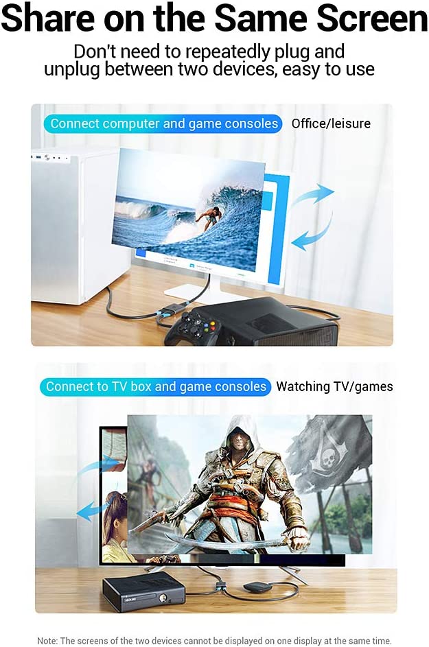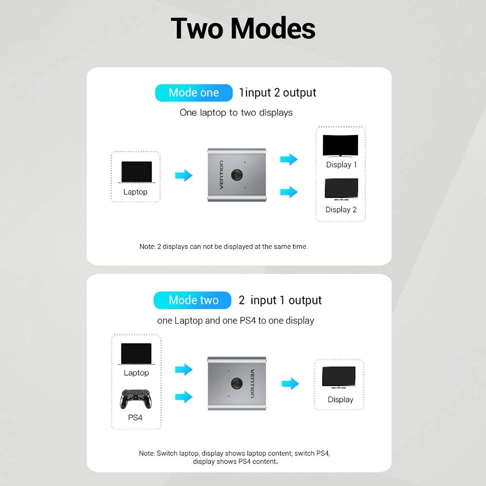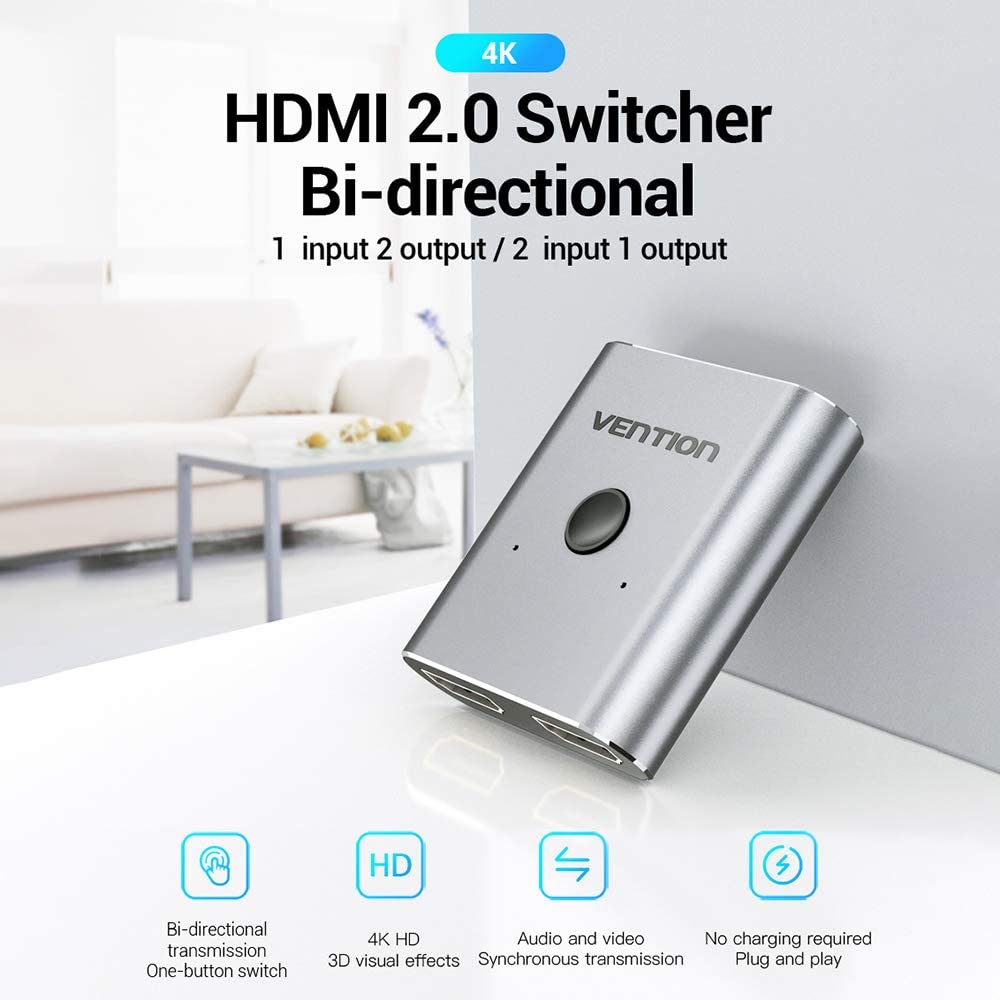 Enhance your home entertainment setup with the Vention HDMI Bi-Direction Switcher Splitter, a versatile solution for managing multiple HDMI devices. This HDMI bi-direction switch allows you to connect two HDMI sources to one display or one source to two displays (note: only one display active at a time), making it perfect for TVs, gaming consoles, and projectors.
